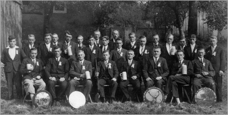 Diese Aufnahme entstand vor dem damaligen Vereinslokal "Roter Ochse", am 1. Juli 1923, anläßlich der 15-jährigen Gründungsfeier des "Zimmerstutzen-Schützenvereins" . Zu dieser Zeit war Hans Paulus 1. Schützenmeister.